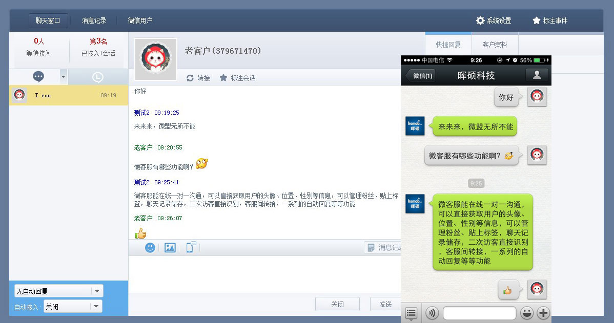 目前功能包含一对一对话、语音实时消息、消息群发、获取全部用户数据、信息管理、客户关系管理、标签设置、聊天记录、常用语管理、访客识别、客服转接、接入设置、自动回复、文件传输等,功能应有尽有,但微信开发团队仍在,只为提供给您们更多的功能。