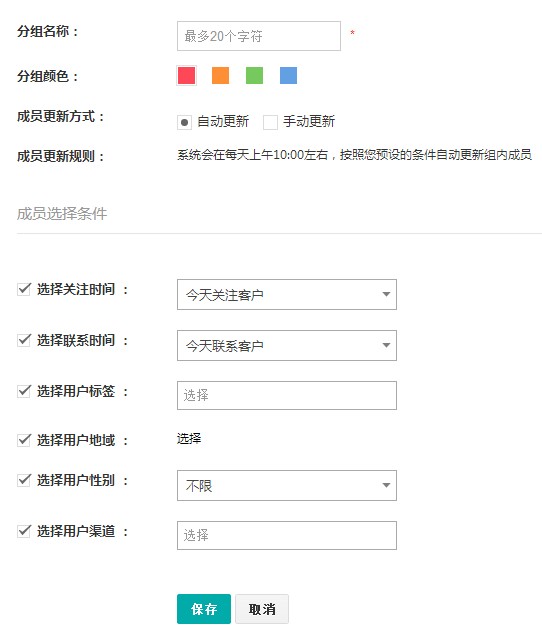 2、 用户分组:自定义分组条件,时刻追踪访客行为,如30天联系客户、7天联系客户、上海客户等,轻松实现精准营销!